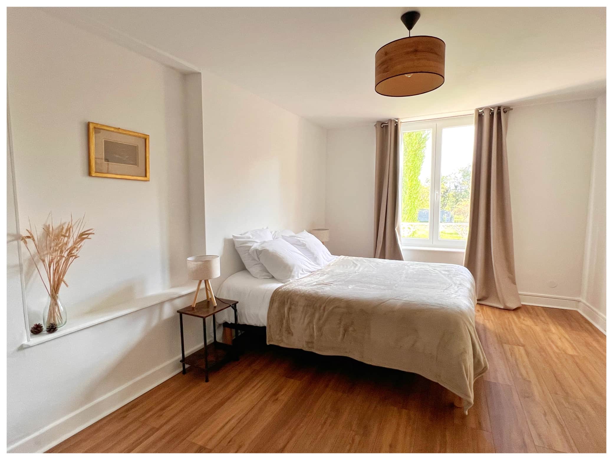 Beautiful, spacious, and bright apartment located on the first floor of the château with a view over the rear garden. This one-bedroom unit includes: a large separate bedroom (queen-size bed 160x200), a living-dining room with a sofa bed (140x200), a fully equipped kitchen, and a bathroom with bathtub and toilet.